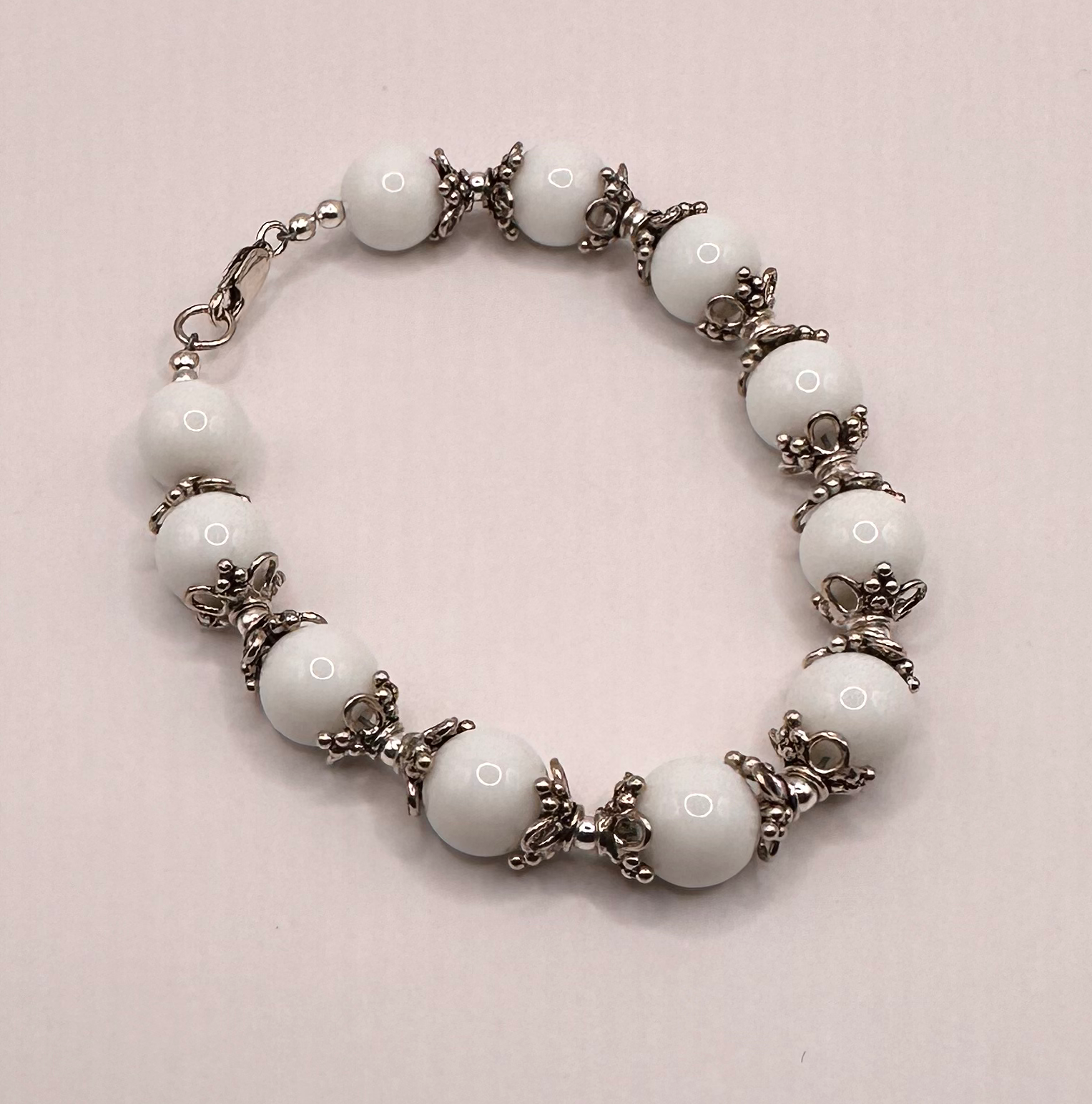 White Jade Bead with Victorian Style Sterling Silver Bead Bracelet