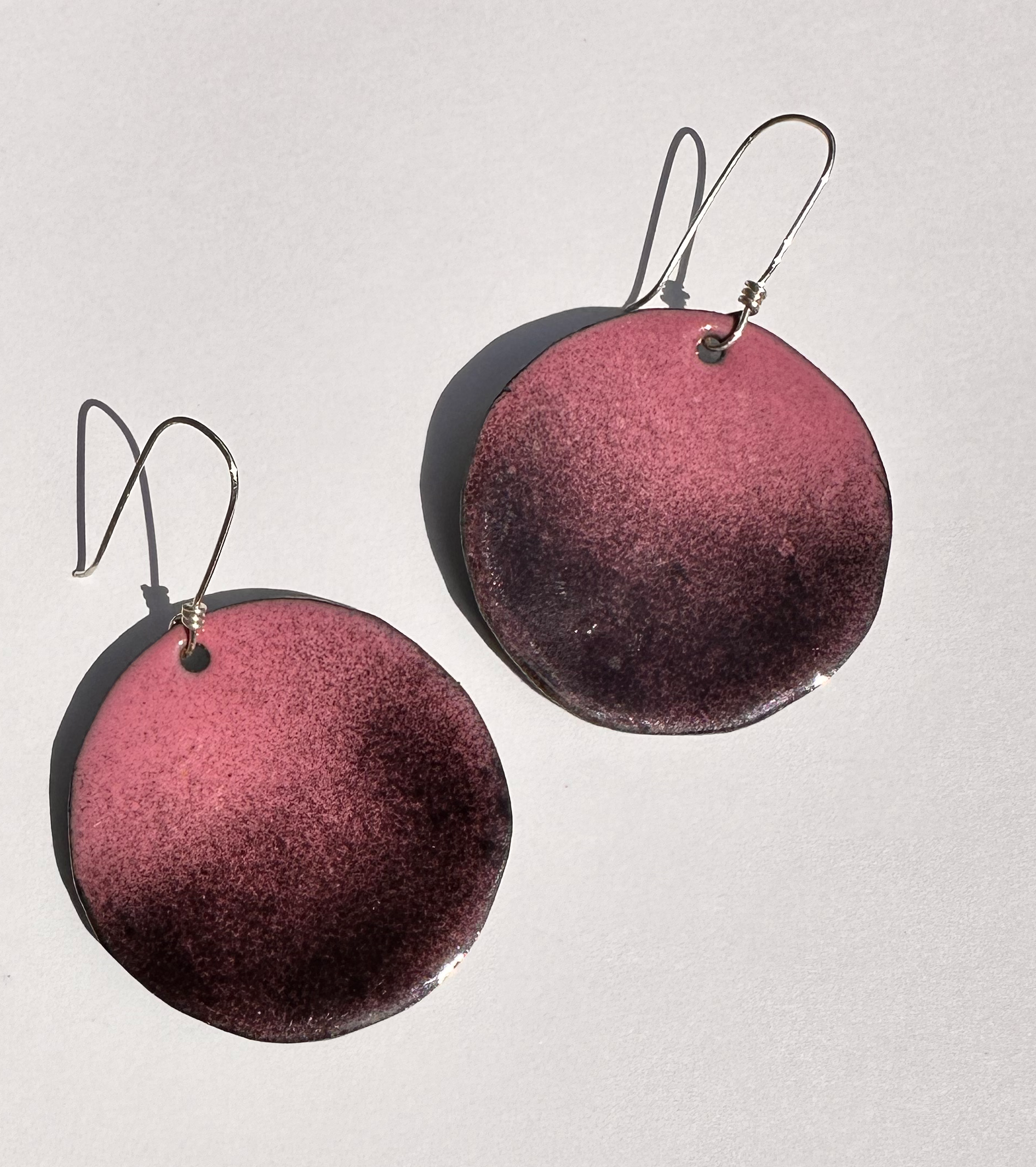 This unique earring design has been torch fired with multiple layers of brilliant colored glass over copper. They hang from handmade sterling silver .925 ear wires. They are definitely eye catching conversation pieces!