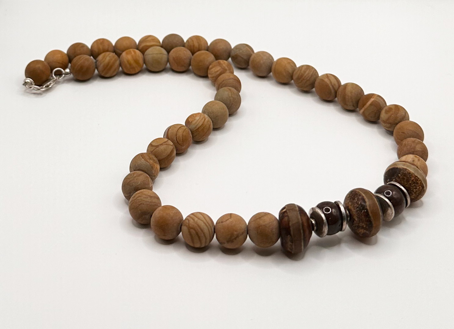 This premium quality men's necklace features Natural Sandalwood Stone beads with Tibetan accent beads. Perfect for any occasion.