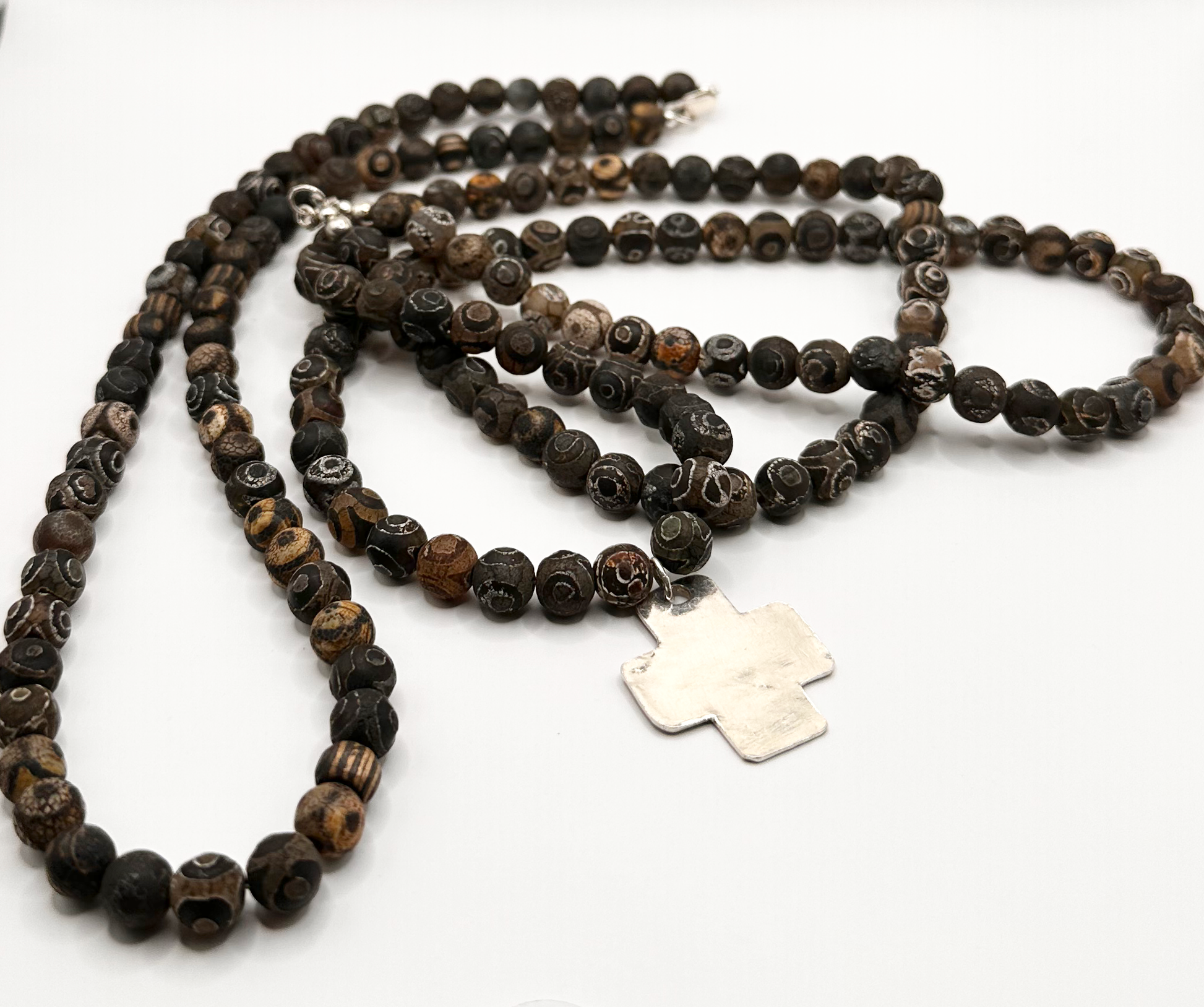 Natural Tiger Skin Sandalwood Double Strand Bead Necklace with a Fine Silver (.999) Cross