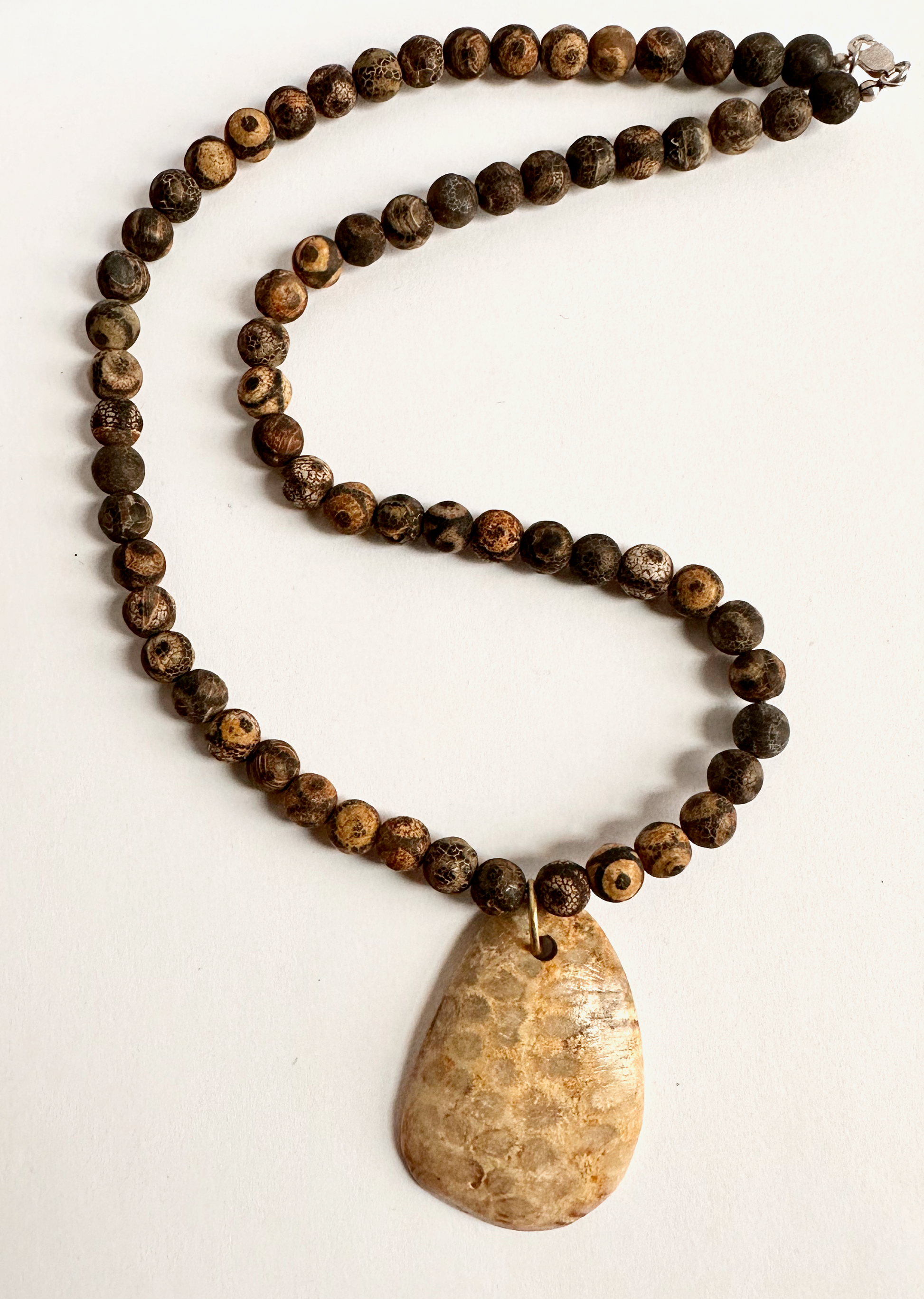 Brown Snakeskin Agate Stone Pendant on a Natural Tiger Skin Sandalwood Bead Chain.
